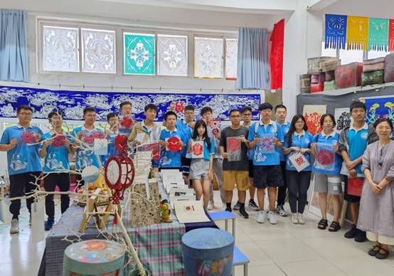 图为“向海问津”实践队员们带着各自的剪纸作品与王倩倩老师合影留念。