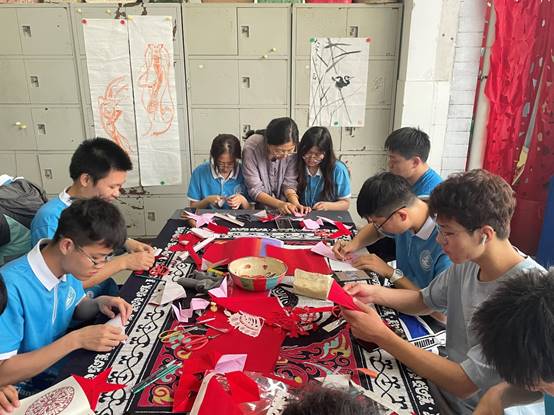 图为实践队员们体验剪纸技艺,互相交流想法,王倩倩老师在旁观察指导。