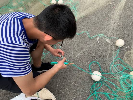 图为实践队员进行渔网编制。