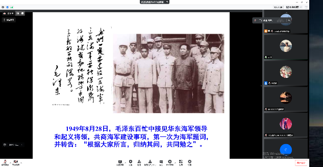 讲座中,陆儒德从海洋意识调查、立法与国家海洋战略、国家海防力量三个层面说明中国人民的海洋意识逐渐觉醒,中国走向海洋的脚步愈发坚定。他指出,“全国人民海洋意识觉醒,中国一定要走向海洋”。随后以毛泽东的海洋战略思想为主线,由点及面展开讲述,从20世纪30年代的早期海洋战略思想到20世纪70年代“建立强大海军”的坚定意志,详细介绍毛泽东的“海上长城”、“海上铁路”思想,带领师生们理解毛泽东海洋战略思想的内涵及其辩证统一的哲学思想的同时,也带领大家一起回顾了新中国建设海洋强国路的艰辛历程。