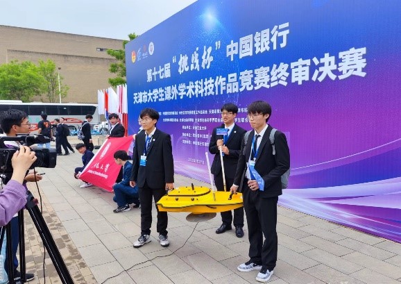 第十八届“挑战杯”全国大学生课外学术作品竞赛将于10月27日至10月31日在贵州大学举办,10月15日,天津团市委组织的针对全国大赛决赛前重点选手参赛材料、文本答辩、现场展示打磨的训练营正式开营,天津市的26支队伍参与其中,我院本科生团队“黑鳍舰队——开创国产无人艇集群战场态势联合感知平台”,参与现场打磨并接受天津电视台采访。