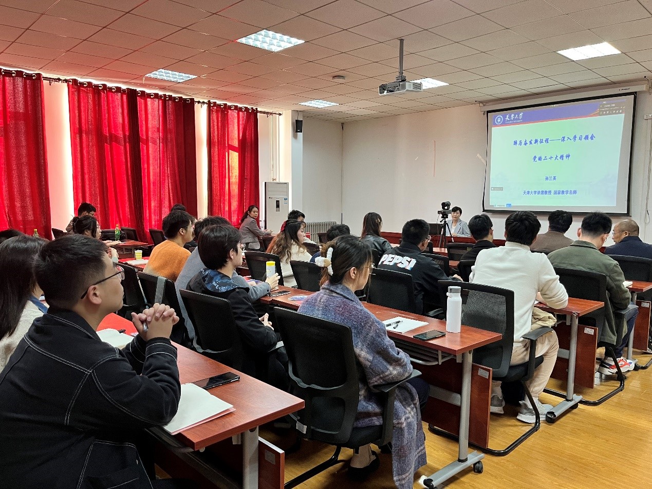 11月4日下午,免费成人影片 党委在卫津路校区第8教学楼319会议室举办党的二十大精神理论辅导报告会。马克思主义学院孙兰英教授受邀作《踔厉奋发新征程—深入学习领会党的二十大精神》专题辅导报告。报告以线上线下结合的方式开展,学院全体师生党员和积极分子代表百余人聆听了报告。学院党委书记单小麟主持报告会。