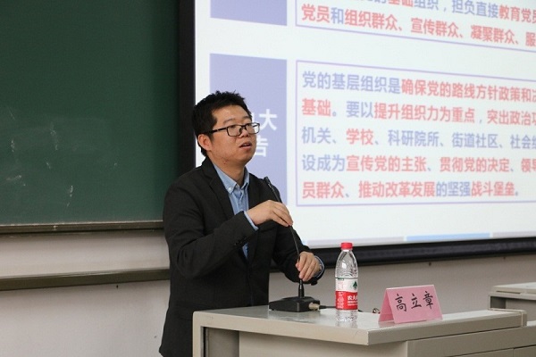 活动伊始,高立章老师从党员的作用、支部的作用出发,明确党员、党支部的职责定位。他讲到,党支部是党的基础组织,直接肩负着教育党员、管理党员、监督党员的任务,是党全部工作和战斗力的基础。详细讲解党支部建设的要求,从党章和十九大报告的学习到党支部组织力培养,以长期从事党建工作经验为切入,理论与实践相结合,层层深入,为学生党建带头人厘清工作思路,更好地服务学生党支部建设;高老师对党内政治生活的组织制度、支部换届选举的工作及党员的发展流程等有关内容进行了介绍,使学生党支部骨干掌握切实有效的工作方法。在最后他强调,学生党支部建设、学生党员的培养关系着学生党建的工作质量,党员骨干要发挥先锋模范作用,以严格的制度建设支部,以严谨的流程、严格的考察发展党员。