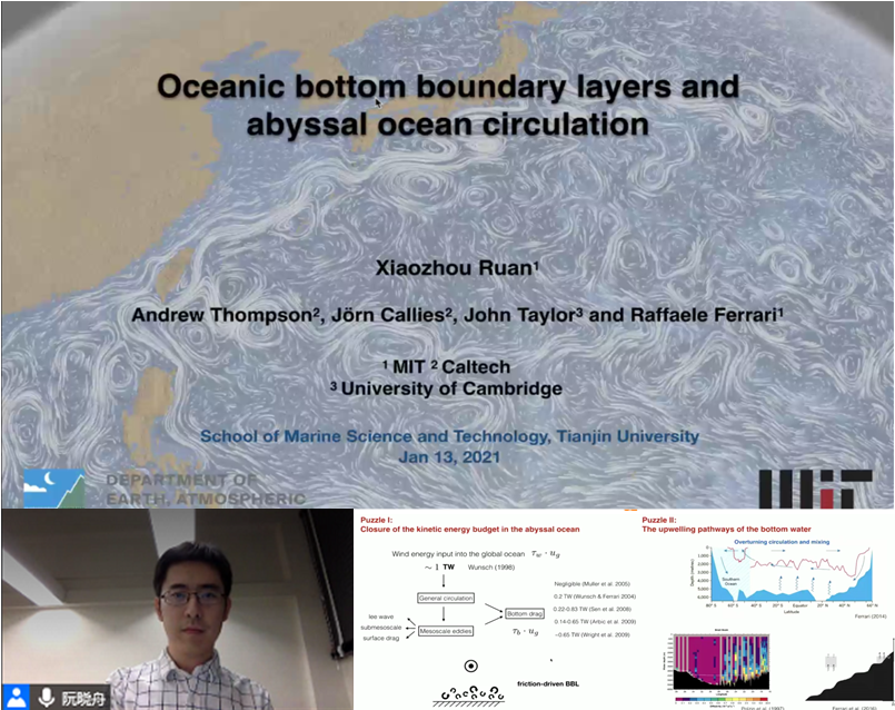 2021年1月13日,免费成人影片 组织智慧海洋系列讲堂。应学院邀请,美国麻省理工学院阮晓舟博士云端做客智慧海洋系列讲堂,为校内外师生带来“Oceanic bottom boundary layers and abyssal ocean circulation”讲座。广大师生踊跃参加,反响积极热烈。