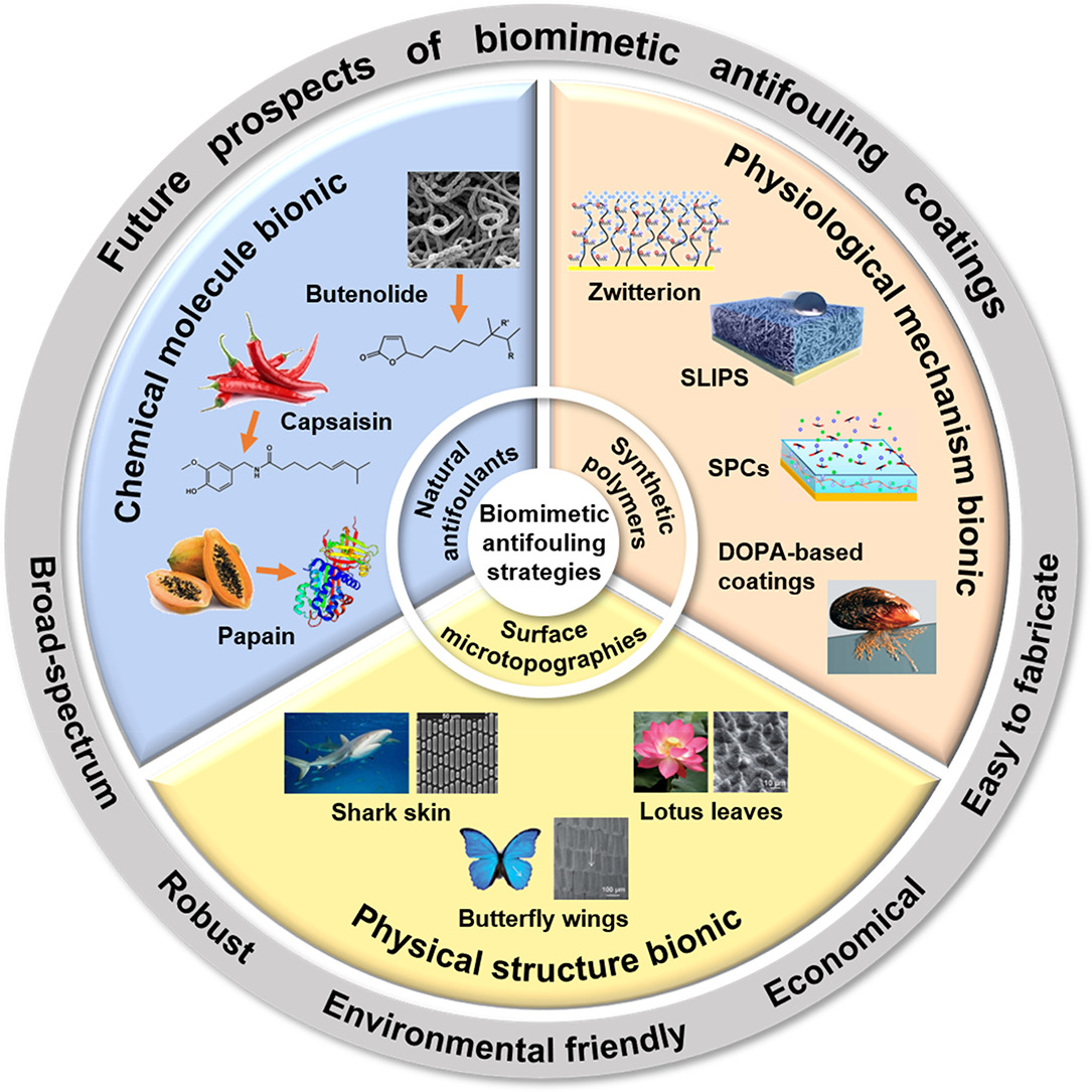 在自然界,很多生物虽然面临污损压力,却能保持自身表面光洁,不被附着。例如,一些海洋生物能分泌对污损生物有驱避效应的化合物;领航鲸的表皮可以自我更新,可有效抵御生物污损。受这些天然防污策略启发,研究者们致力于开发绿色环保防污涂层。本文从仿生的视角探讨了海洋防污涂层的研究前沿,从仿生学的三个维度出发,阐述了化学分子仿生、生理机制仿生和物理结构仿生三种主要策略对防污涂层构建的启示,分别介绍了天然防污剂、仿生高分子防污涂层和仿生表面微结构防污涂层的研究现状,并阐释了这些涂层的防污机理。同时,本文总结了这些防污涂层的主要制备方法和防污性能,分析了它们的优缺点,提出该领域存在的问题,并对未来的研究进行展望。