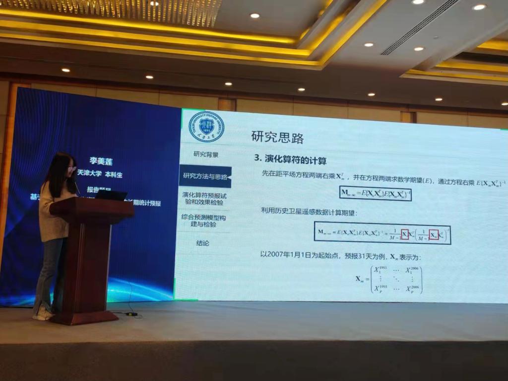 我院海洋科学系2018级本科生李美莲作为本次会议唯一一名本科生报告人,以《基于演化算符的南海海面高度异常中长期统计预报》进行了口头学术报告。在报告中,针对当前海洋数值预报时效短,难以满足水下移动平台保障需求的难题,设计了一种基于演化算符的统计预测方法,利用历史卫星遥感资料构建海洋状态变量中长期演化矩阵,并结合惯性预报模型,构建了最终的南海海洋中长期统计预报模型,能够提供0~60天逐日的南海海面高度异常预测结果。基于该方法的南海中长期预测试验结果表明该方法能够较为快捷、合理地提供预报时长为0~60天的中长期预测,优于常规的惯性预测和气候态预测结果。
