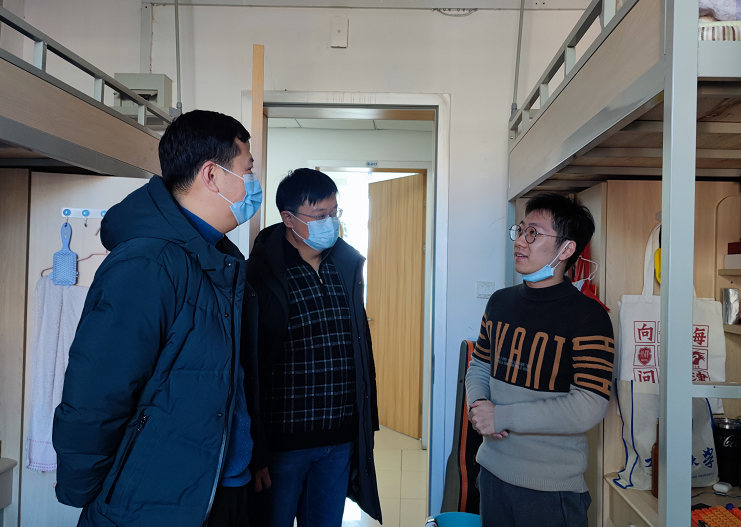 凌国维一行首先来到41斋,走访各个宿舍,实地关心学生生活。了解疫情到来后同学们的生活、学习情况,勉励同学们调整作息时间,加强身体锻炼,合理规划学习科研任务,并嘱咐学生有需要、有困难要及时和学院反馈,顺利度过疫情期间的在校时光。