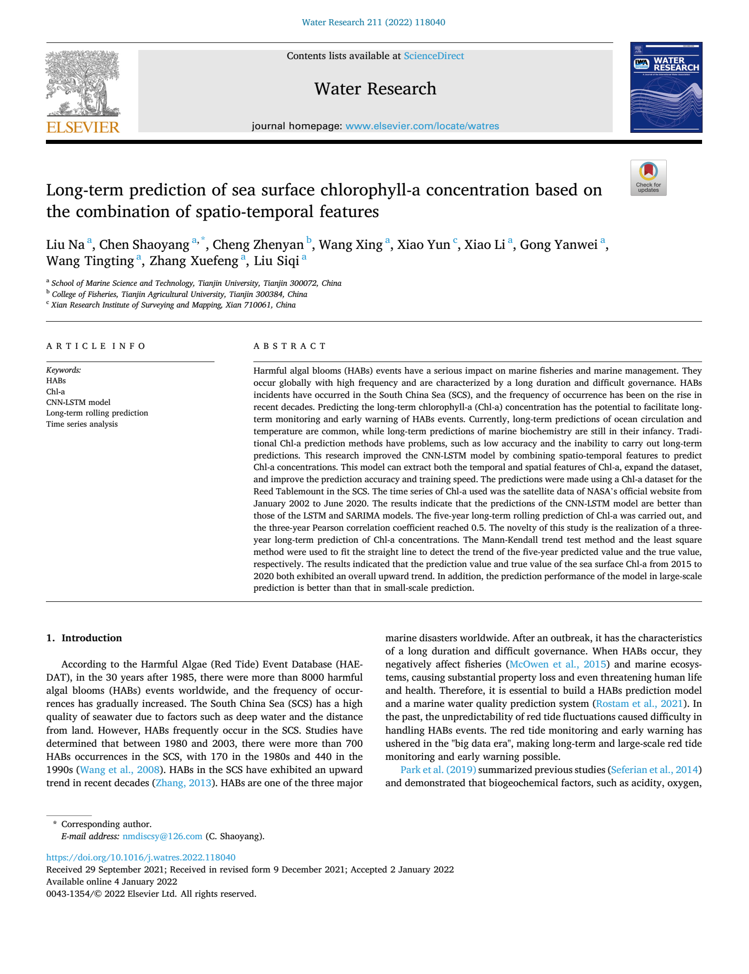 日前,免费成人影片 免费成人影片 师生在海洋环境要素长期预测方向取得重要研究成果,通过改进一种结合时空特征的CNN-LSTM深度学习模型预测chlor_a(叶绿素a)的浓度变化,解决了传统的chlor_a预测方法精度低、不能长期预测等问题,能够为有害藻华事件的长期监测和预警提供技术支撑,体现了海洋管理与海洋技术的深度学科融合。该研究成果以论文形式发表于自然指数统计源期刊Water Research(影响因子11.236),题为:Long-term prediction of sea surface chlorophyll-a concentration based on the combination of spatio-temporal features。免费成人影片 免费成人影片 硕士研究生刘娜为论文的第一作者,陈韶阳副教授为通讯作者。