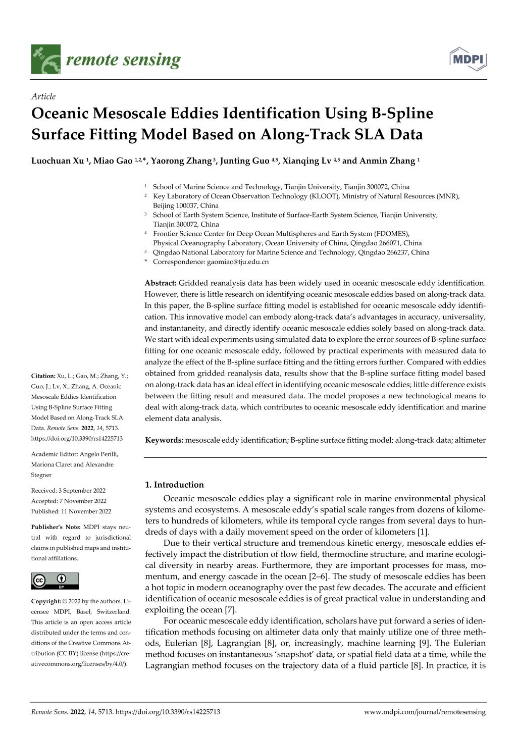 Xu, L.; Gao, M.; Zhang, Y.; Guo, J.; Lv, X.; Zhang, A. Oceanic Mesoscale Eddies Identification Using B-Spline Surface Fitting Model Based on Along-Track SLA Data. Remote Sens. 2022, 14, 5713. //doi.org/10.3390/rs14225713
