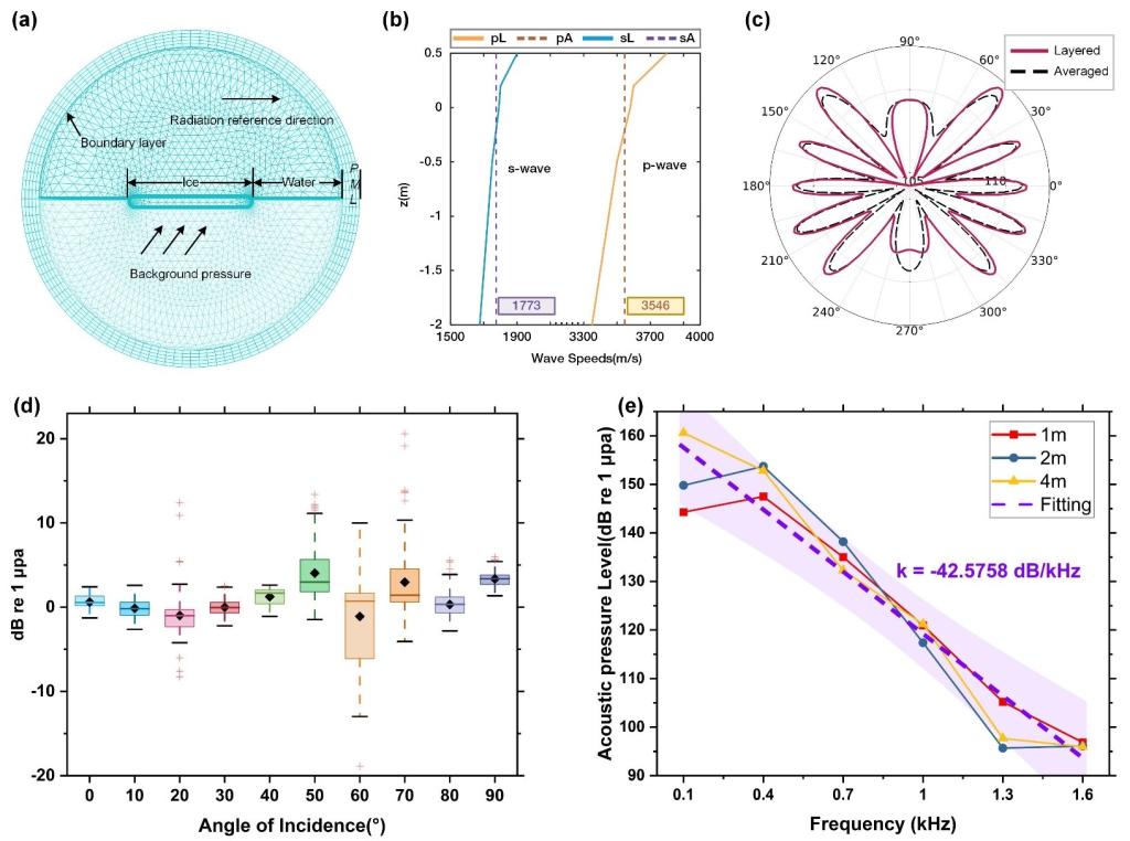 针对现有方法的不足,本文融合浮冰的一般性和微观性结构参数,提出了一种基于浮冰参数聚类的有限元声场计算模型。该方法解决的问题有:(1)从实测数据出发,阐述了当前覆冰海域声场建模的重点;(2)利用CryoSat-2、CFSv2等多源数据描述了浮冰的结构参数特性,并将动态浮冰划分为具有一般性的三种典型浮冰类型,为精细化建模提供了重要参考;(3)将浮冰视为具有随机粗糙起伏且浮冰块尺寸满足一定分布特征的多层非均匀弹性介质,保持了浮冰材料声学属性的高度还原;(4)利用流-固耦合边界建立了冰-水边界的相互作用,验证并捕捉到了冰下的散射特征;(5)运用有限元将求解域离散,即将冰层离散成若干浮冰块,考虑开阔水域对模型的影响。文章所提出的新型声场计算模型与35km长的冰下实验结果高度吻合。