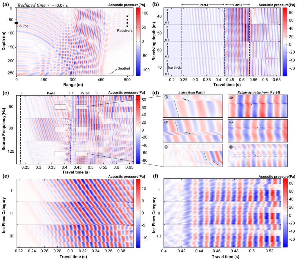本文所提出的覆冰海域声场新思路,其研究的重要价值在于:(1)在覆冰海域中,以聚类方法提供区域一般性浮冰声学参数,为声场建模参数困惑性选取提供重要参考;(2)流-固耦合条件下的有限元算法,其时域解保证了较高的计算精度,可以更好的捕捉到冰下声场特征;(3)算法精度的提高,使得我们可以准确捕捉到多个到达波峰间的时延差异,总结出冰厚等参数变化时的声场响应规律,从而提供一种新的北极冰层探测方案。