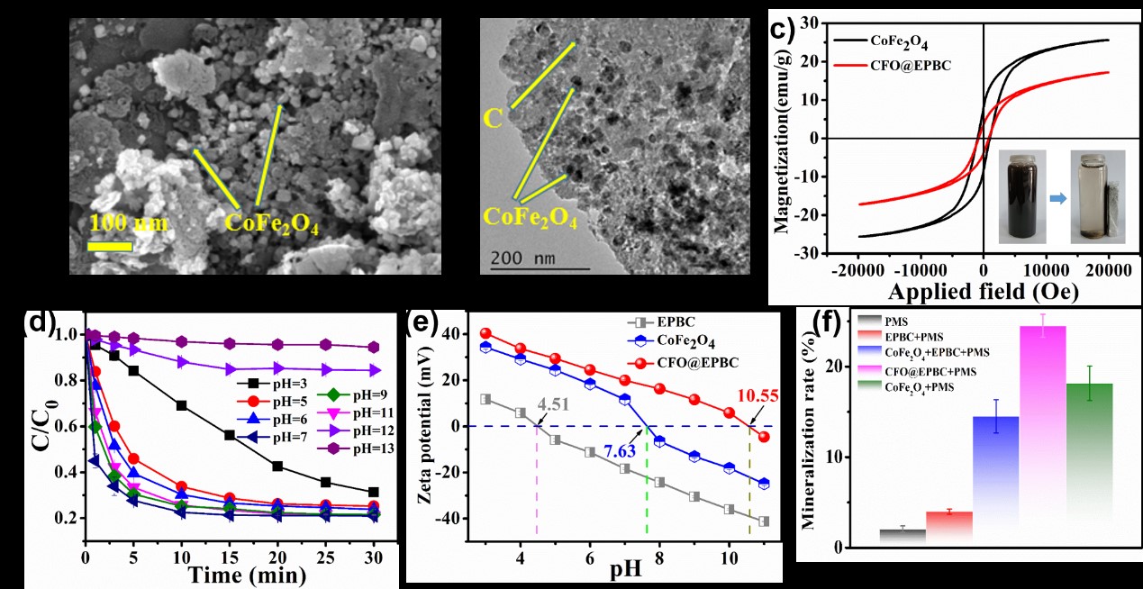 高级氧化技术(AOPs)被广泛认为是一种去除水中难降解有机物的有效方法。基于钴/铁氧化物纳米材料的非均相高级氧化技术具有优异的污染物降解性能和磁分离特性,但其相对较窄的pH适用范围限制了其实际应用。此外,钴/铁氧化物纳米颗粒表面能较高,易发生团聚现象,严重削弱了此类材料的催化性能。