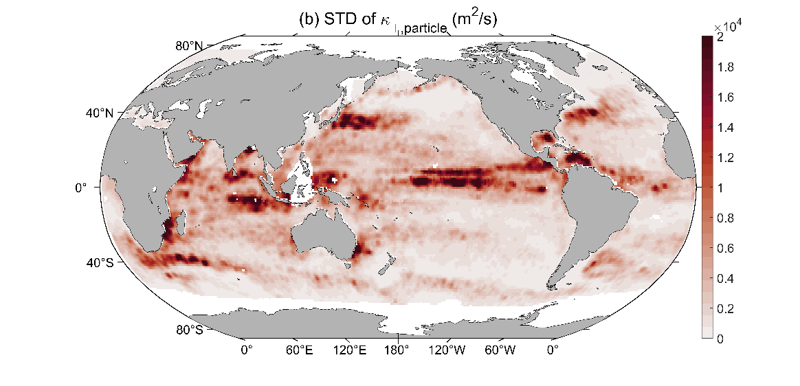 图1 全球海表面基于粒子的跨流涡旋扩散率24年年平均的标准差(m2/s)。