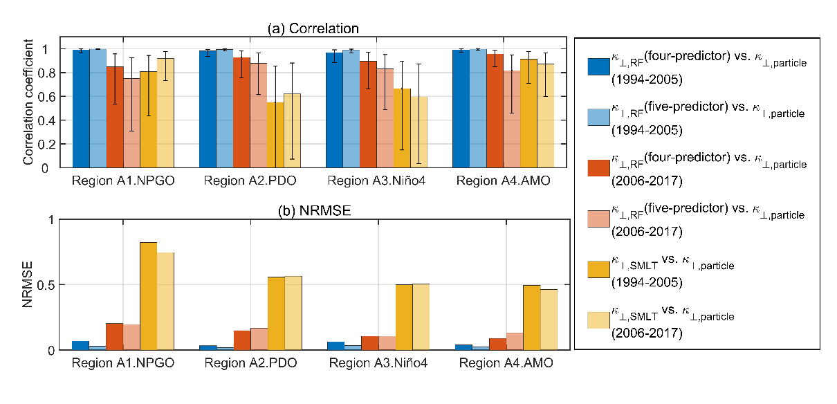 图4 基于粒子的涡旋扩散率与基于SMLT和RF的涡旋扩散率的(a)相关系数和(b)NRMSE,即RMSE使用气候平均值做归一化处理。