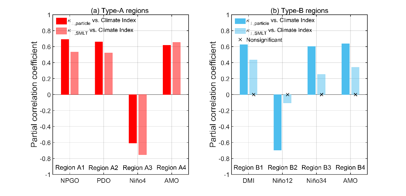 本研究使用1994-2017年的卫星观测数据和拉格朗日粒子法诊断全球海表面涡旋扩散率。研究结果表明,全球海表涡旋混合具有不可忽略的年际变化(图1)。通过对全球涡旋扩散率与大尺度气候指数时间序列之间的相关性分析,发现区域涡旋混合和气候因子存在显著的相关性(图2),并将该结果与混合长度抑制理论(suppressed mixing length theory,SMLT)的结果做了对比。