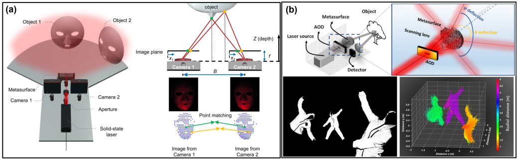 图3 (a)光学设置和立体匹配算法的原理图(b)激光雷达系统的示意图及其三维测距演示