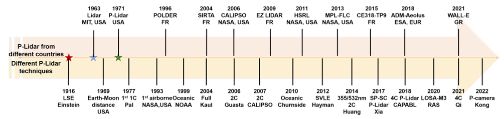 论文首先简要介绍了偏振激光雷达的构成,按时间顺序总结了其技术发展过程(图1),整理了偏振及偏振激光雷达的基本原理,并列举了几种典型的系统。