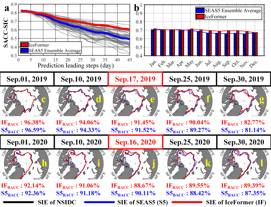 通过与欧洲中期天气预报中心(ECMWF)的全球冰海耦合季节尺度预报系统(SEAS5)比较。IceFormer在融冰季节的预报性能明显优于SEAS5。同时,IceFormer的单次预报性能优于SEAS5的51组集成平均。结果表明,IceFormer对不同时空尺度上的海冰演化具有较强的预报能力,对提升北极海冰集合预报具有一定参考价值。
