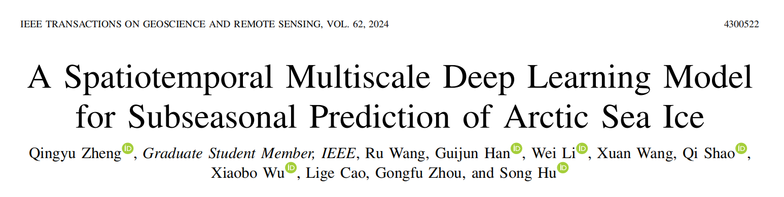 6. Zheng Qingyu, Wang Ru, Han Guijun*, Li Wei*, Wang Xuan, Shao Qi, Wu Xiaobo, Cao Lige, Zhou Gongfu, Hu Song, 2024: A Spatio-Temporal Multiscale Deep Learning Model for Subseasonal Prediction of Arctic Sea Ice, IEEE Transactions on Geoscience and Remote Sensing, 62, doi: 10.1109/TGRS.2024.3355238.(Q1, IF: 8.8, Citation: 0, 发表当年影响因子: 8.2, 中科院分区: 1区)