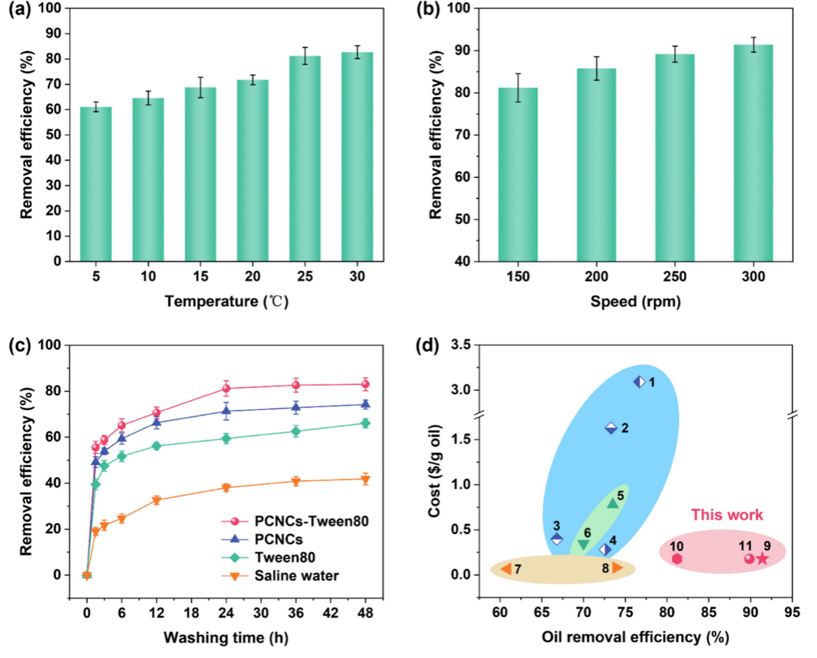 图2复合清洗剂在(a)不同温度,(b)不同清洗转速和(c)不同组分下的除油效果。(d)用于清洁油砂的不同清洁剂的除油效率和材料成本的比较。