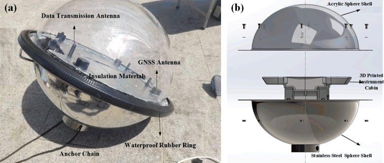 本研究设计了一款低成本多天线GNSS浮标MGB-2,如图2所示,主要目标是实现海洋潮位、波浪等水文参数的原位观测。该浮标包含多个低成本GNSS模块,不仅可提升测量结果的可靠性,还可以实现自身姿态的测量。内部采用3D打印技术,可根据需求增加传感器种类和数量。整个浮标重量约20kg,无需专业设备即可完成布放,具备易布放(Easy To Deploy, EOT)特性。