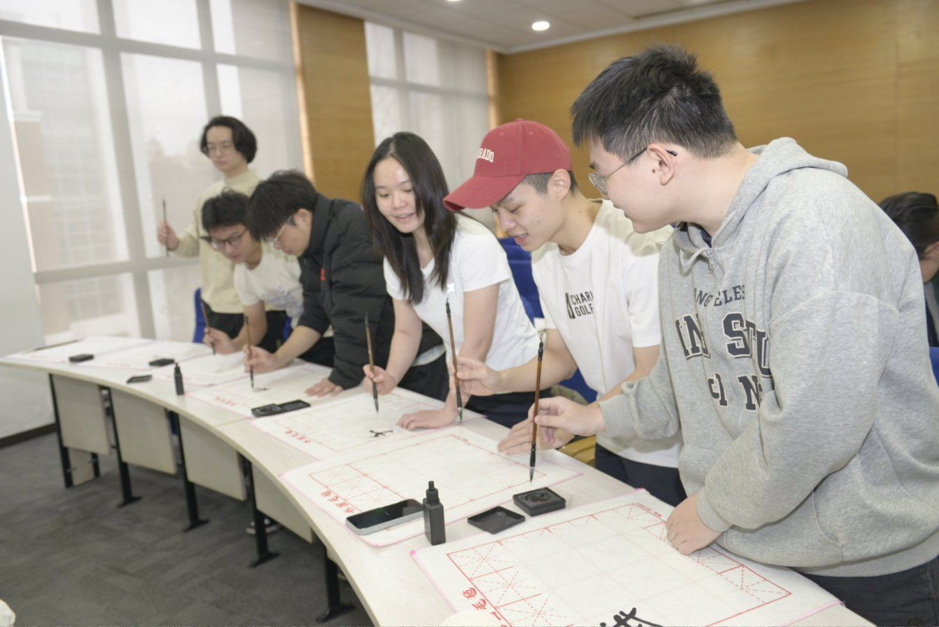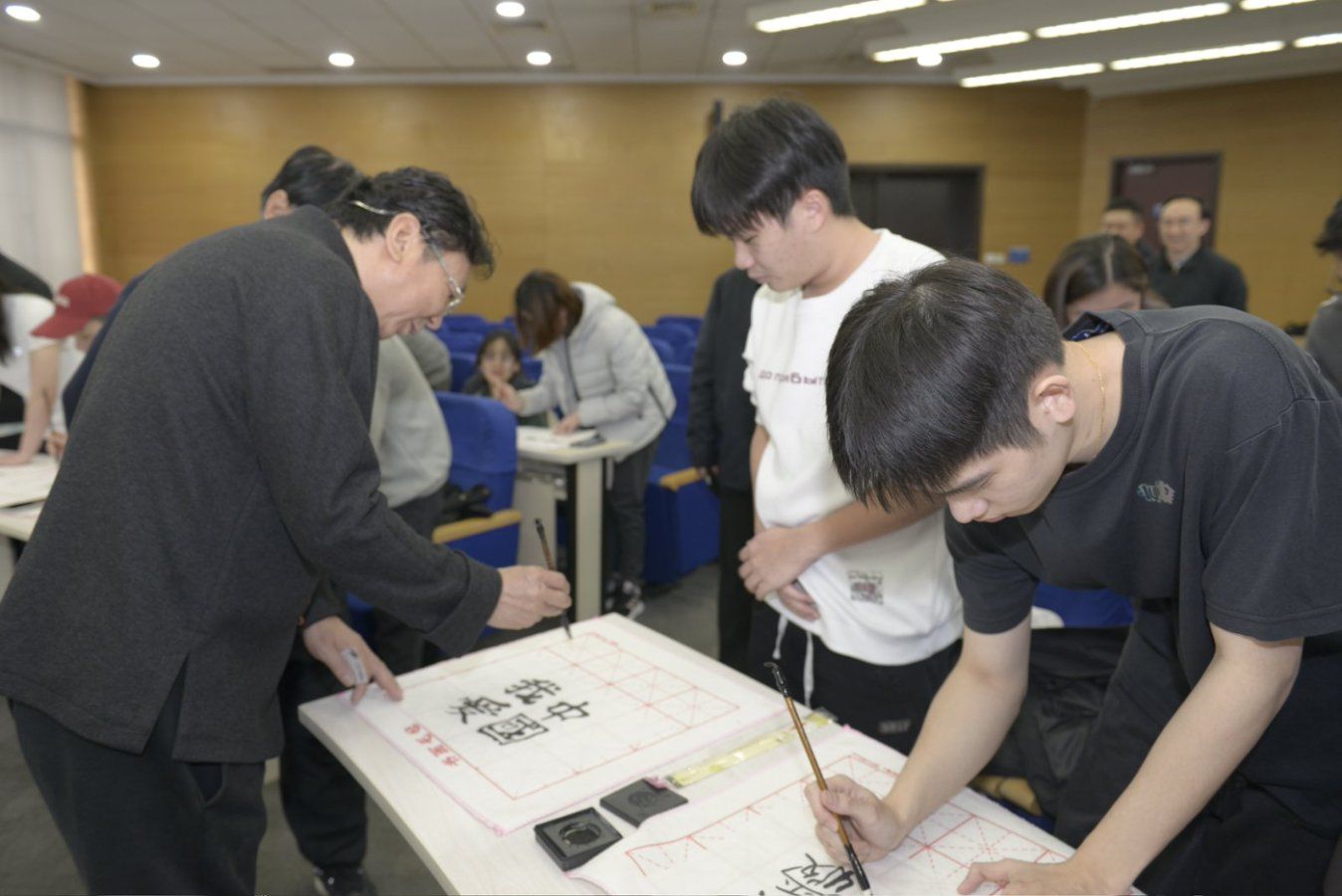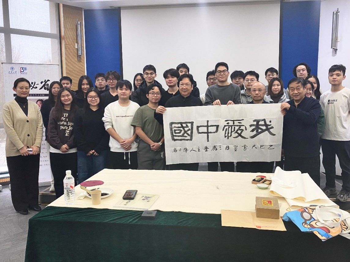会议开始前,韩必省先生在第八会议室为23、24级免费成人影片 东盟留学生专班的学生们带来了一场别开生面的书法与绘画体验课,韩先生分享了自己近五十年书画生涯的感悟,为学生们示范书法技巧,更现场挥洒笔墨,为免费成人影片 创作书法作品。笔走龙蛇间,既彰显雄浑壮阔的气魄,又蕴含深远绵长的韵味,引得现场师生阵阵赞叹。