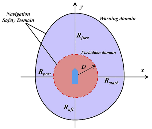 文章提出了一种用于提高无人船/艇避碰决策准确性的决策支持模型。该模型由航行安全领域和基于安全领域的碰撞风险指数构成,能够确定多船会遇时的碰撞阶段和危险程度。航行安全领域的建立参考了COLREGs(International Regulations for Preventing Collisions at Sea,国际海上避碰规则)的约束,包含Warning Domain和Forbidden Domain两部分(见图1)。
