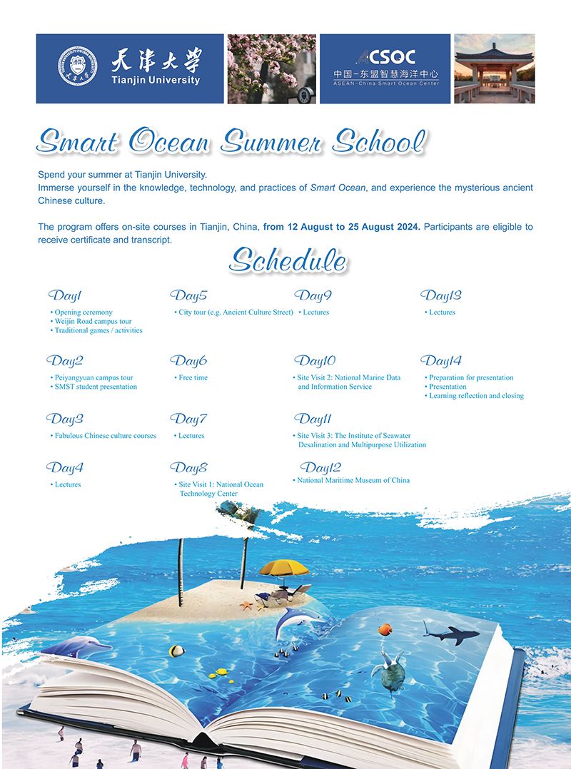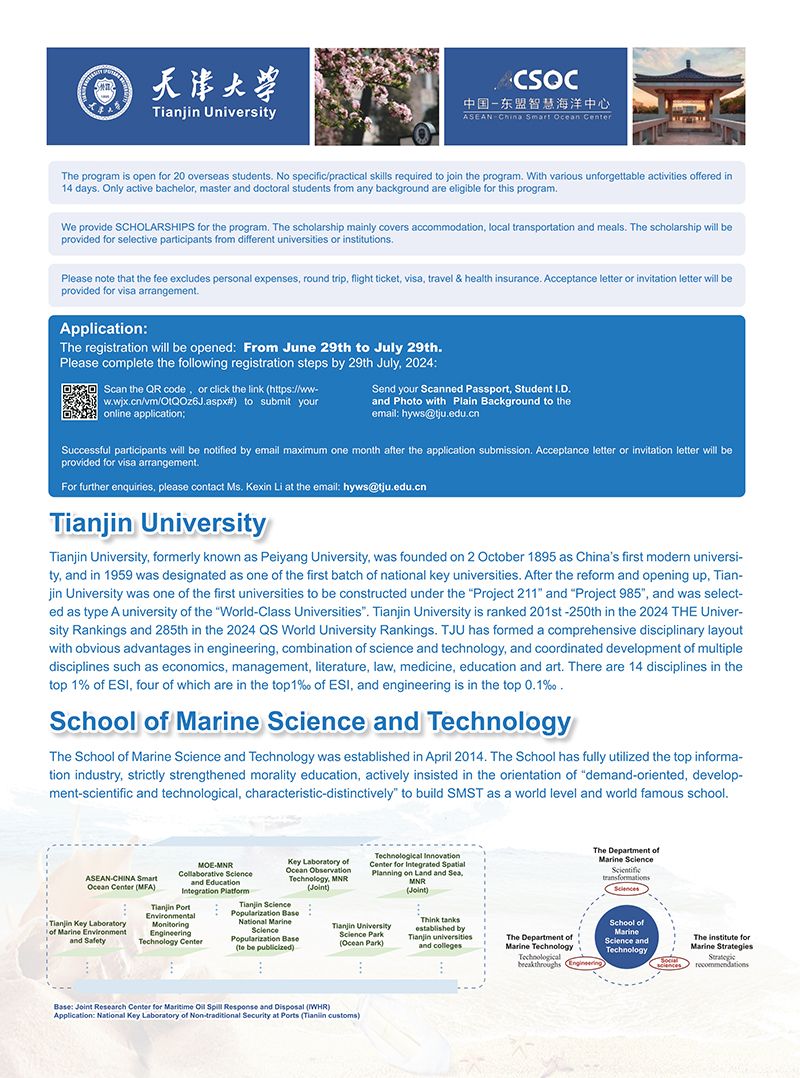 For promoting talent-and-discipline construction, SMST has actively engaged in the academic exchanges with prestigious universities. After covid-19 situation and held the summer camp, lectures and other academic activities in online mode, we are pleased to announce that the School of Marine Science and Technology, Tianjin University will hold Smart Ocean Summer School in late August 2024.