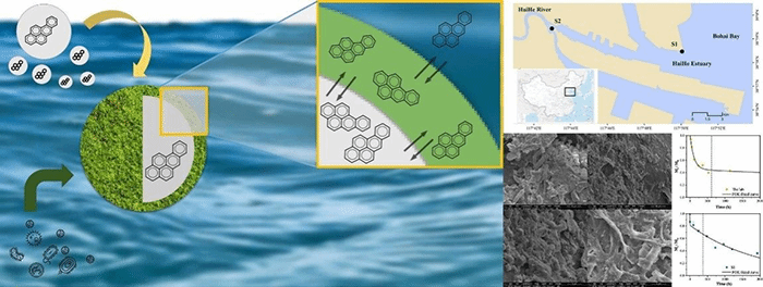 To further investigate the impact of biofilms on the desorption of microplastic composite pollutants and the kinetics of desorption in seawater environments, the research team deployed polyethylene (PE) sheets pre-adsorbed with different concentrations of the non-polar pollutant, benzo[a]pyrene (BaP), in situ at the Hai River estuary to study desorption kinetics under natural biofilm colonization conditions. Based on the desorption kinetics of BaP from the PE sheets, a mass transfer model was constructed to describe the desorption process of non-polar pollutants from PE under the influence of biofilm formation. The research demonstrated that biofilms, acting as an intermediary between plastics and aquatic environments, did not serve as a sink for BaP adsorbed in plastics. Instead, they altered the mass transfer process of BaP at the boundary layer by reducing the distribution coefficient of BaP between the plastic and boundary layer. Furthermore, based on the diffusion mass transfer model developed by the team, predictions were made regarding the impacts of biofilms on the fate of other non-polar and weakly polar pollutants in PE. This study emphasizes the influence of biofilms on the desorption of hydrophobic pollutants from plastics in real environments and provides new insights into the leaching processes of additives from plastics.